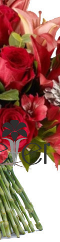 6 Red Roses, 4 Red Lilies, Red Alstroemeria, Pinecones