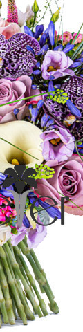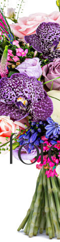 4 Pink / Lavender Roses, 2 White Calla Lilies, Purple Vanda Orchids, Blue Agapanthus, Bouvardia